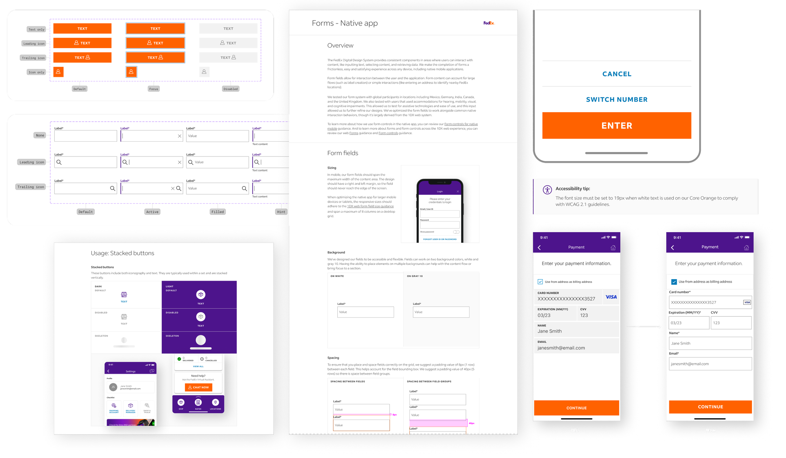 We guided the team away from using native form fields and delivered a new component set based on FedEx’s web inputs. Because the input fields would be custom, we wrote documentation to give designers and developers the ability to leverage native features, including keyboards and dropdown menus.