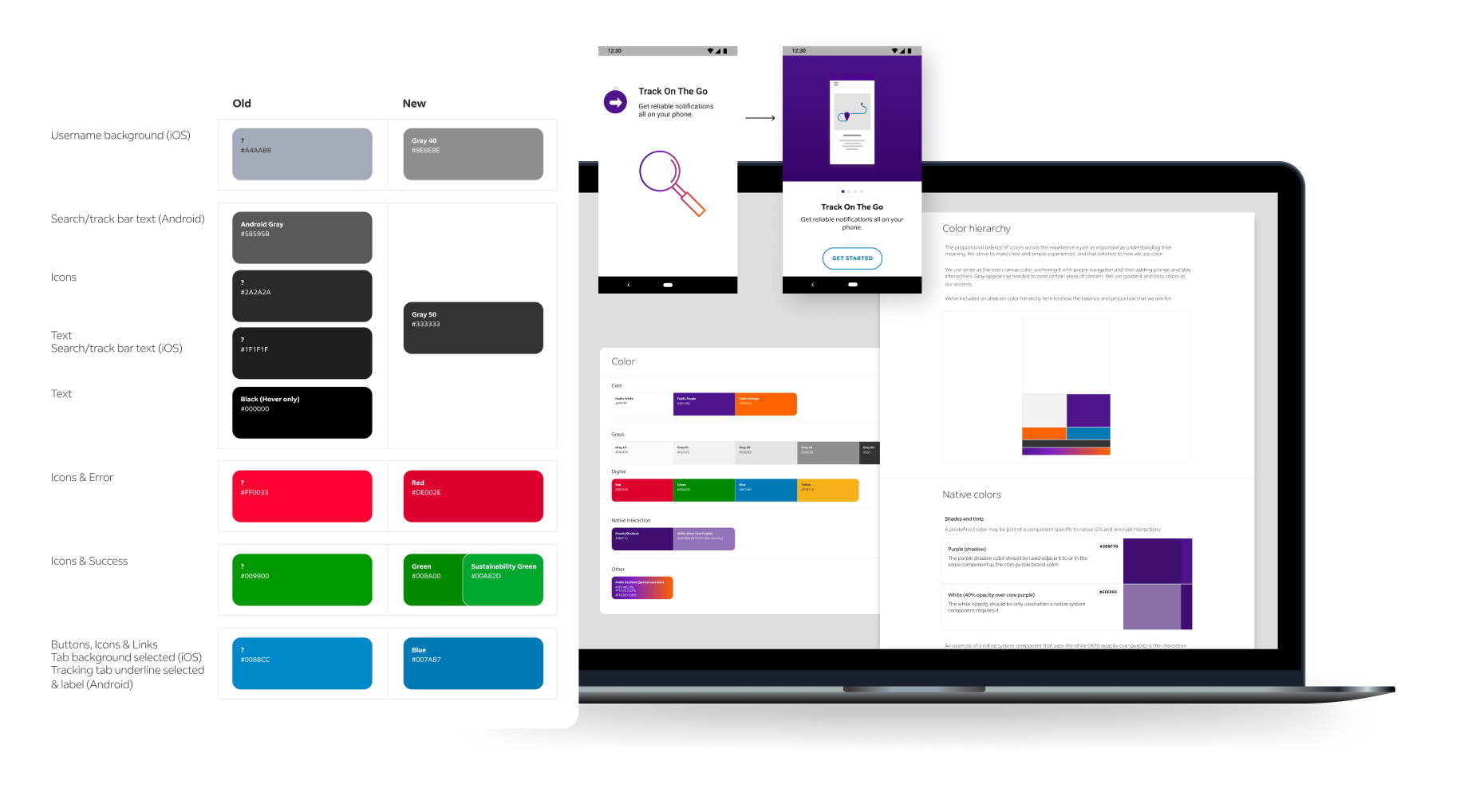 We enhanced the FedEx color palette for the native app with two additional colors to help with shadows and depth. We provided written guidance to support how to use se new colors.