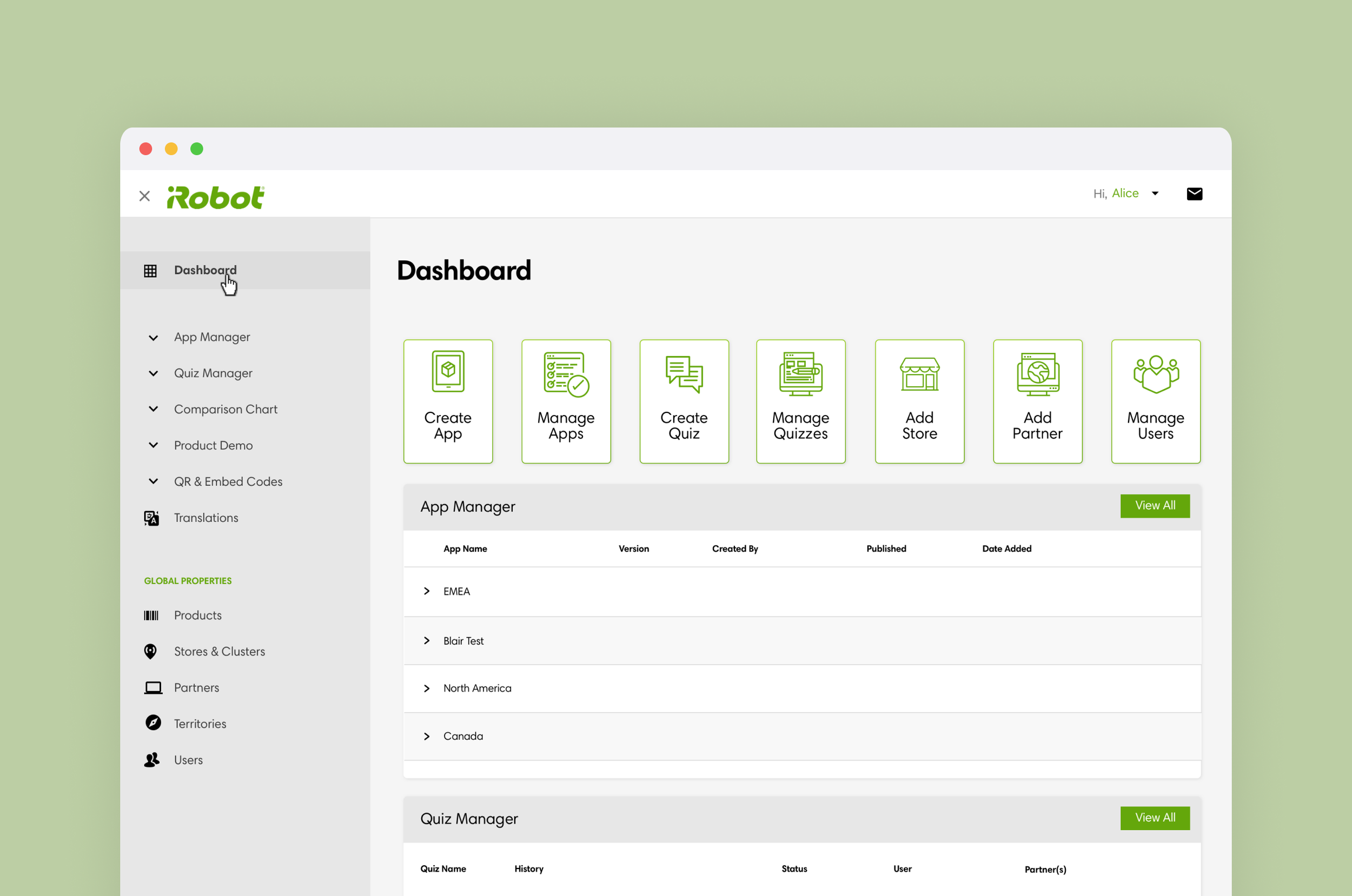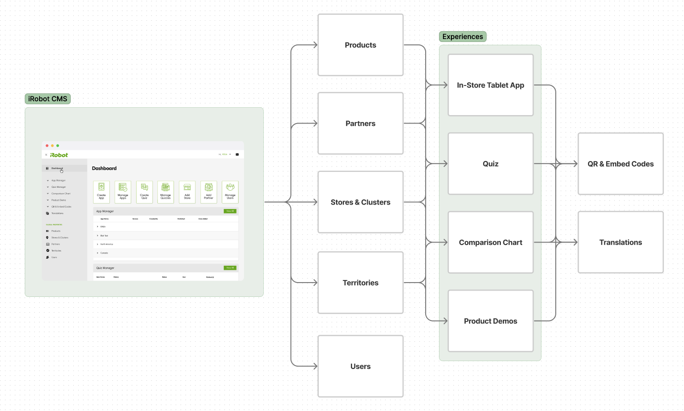 iRobot requested a custom content management system for their online experiences as a place to manage assets and visual presence. Some experiences managed through the CMS are online quizzes, comparison charts, interactive product demos, AR product demos, 360 degree rotational product demos, and in-store tablet apps. The site also holds information for product lines and live QR code links. Our task was to ensure these experiences are fully customizable by the iRobot team while collecting valuable consumer analytics.