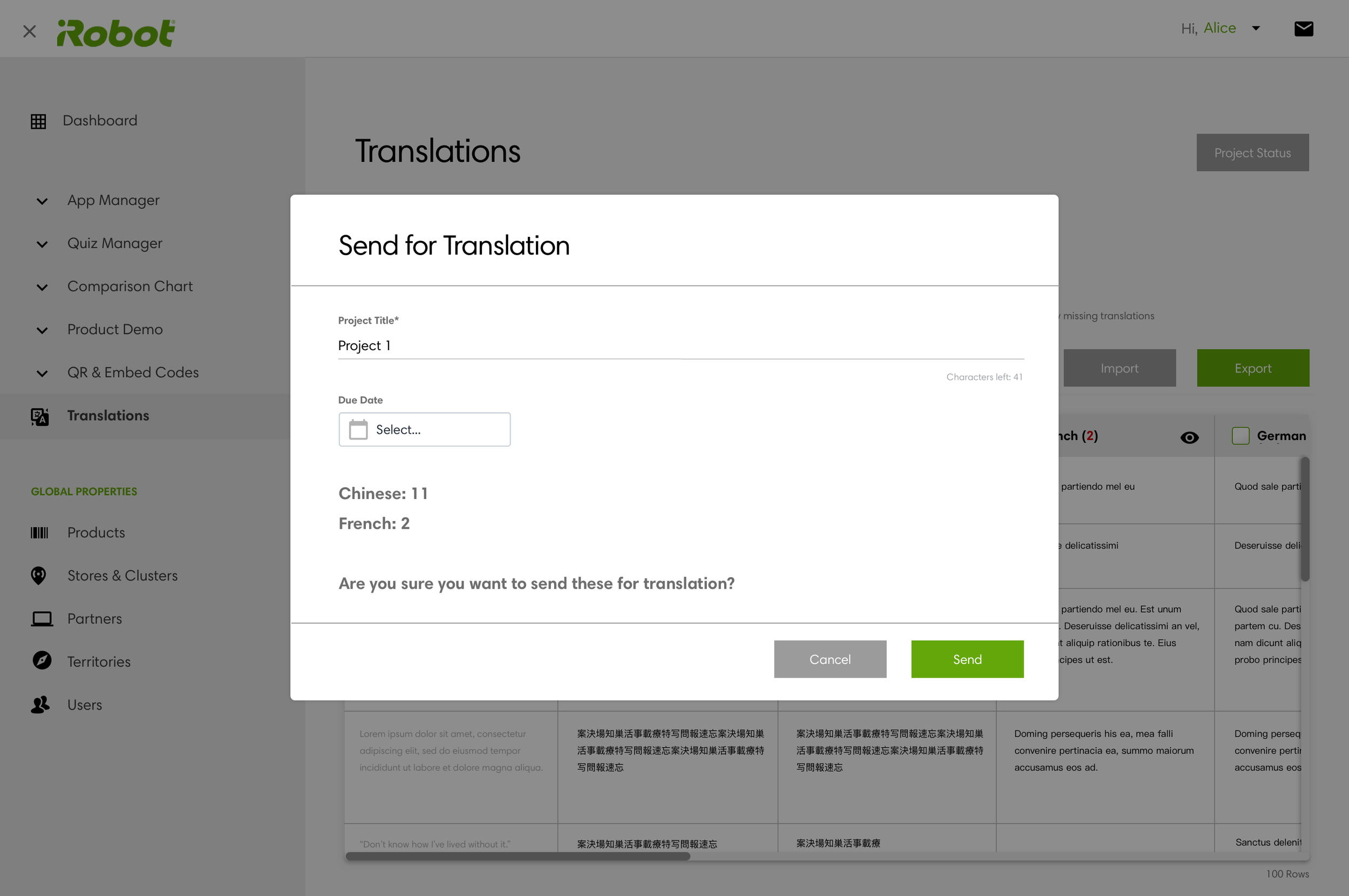 As a global company, the business needed a way to translate all digital experiences. The translations module allows for the iRobot team to see all text entered into the CMS fields in a centralized table that includes all supported languages. If an English line has been entered and saved in an experience, the table will show a flag on that text until each translation has been entered.
