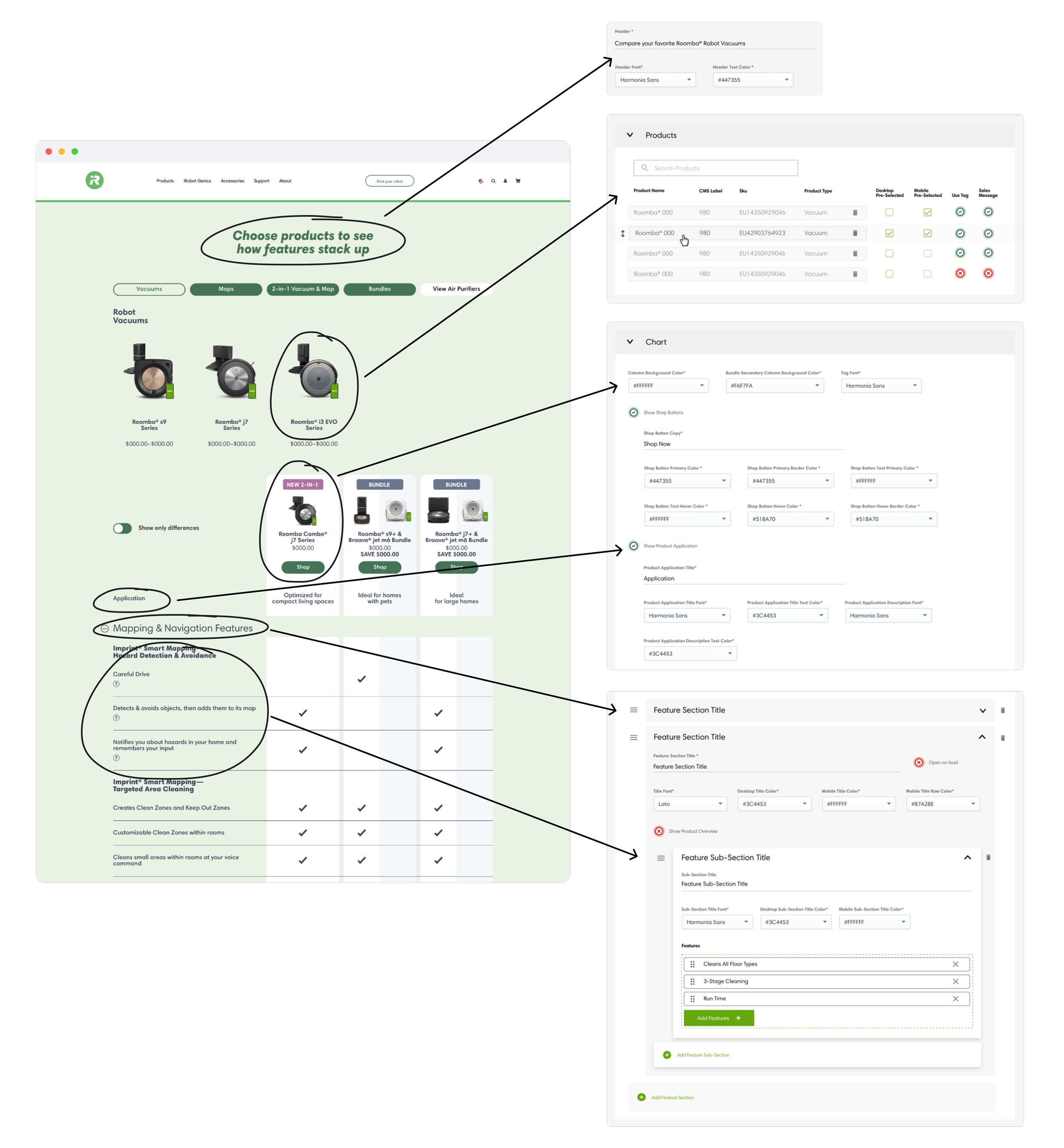 The image below shows an example of how customizable each experience is through the CMS. Using the Comparison Chart design, I mapped out a few areas to their specific field components. For example, the header text can be changed along with certain styling like font and color. We determine with the client what is necessary for customization without disrupting the integrity of the design. Our client felt content with the placement and breakpoints in the text, so customization for size and alignment was not necessary. Sometimes, too much control over the design can lead to confusion or misjudgment on the client end as they are trying to quickly input content.
