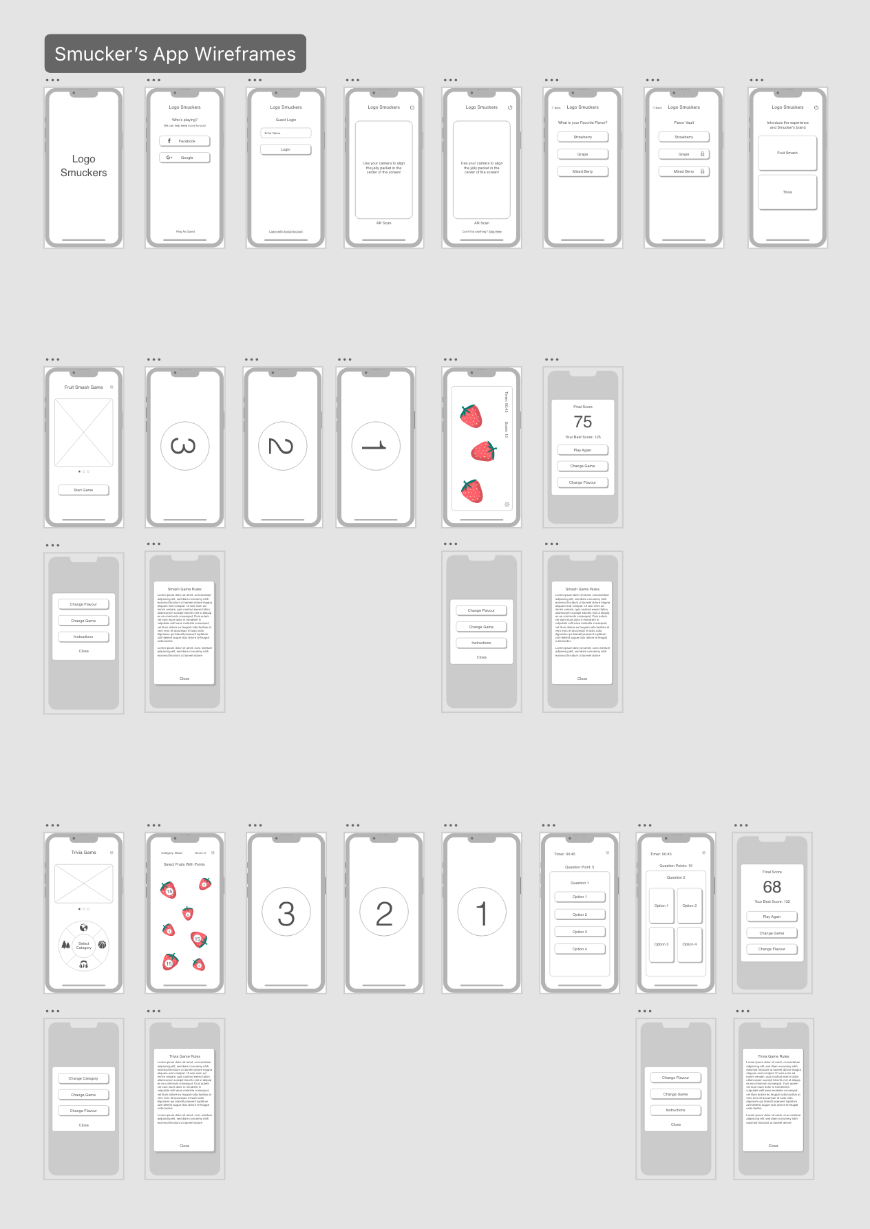 We split the wireframes into three sections - sign in/AR scan, smash game, and trivia game. The sign in process now offers SSO or an optional guest user. Going through each should always bring the user to the AR scan.