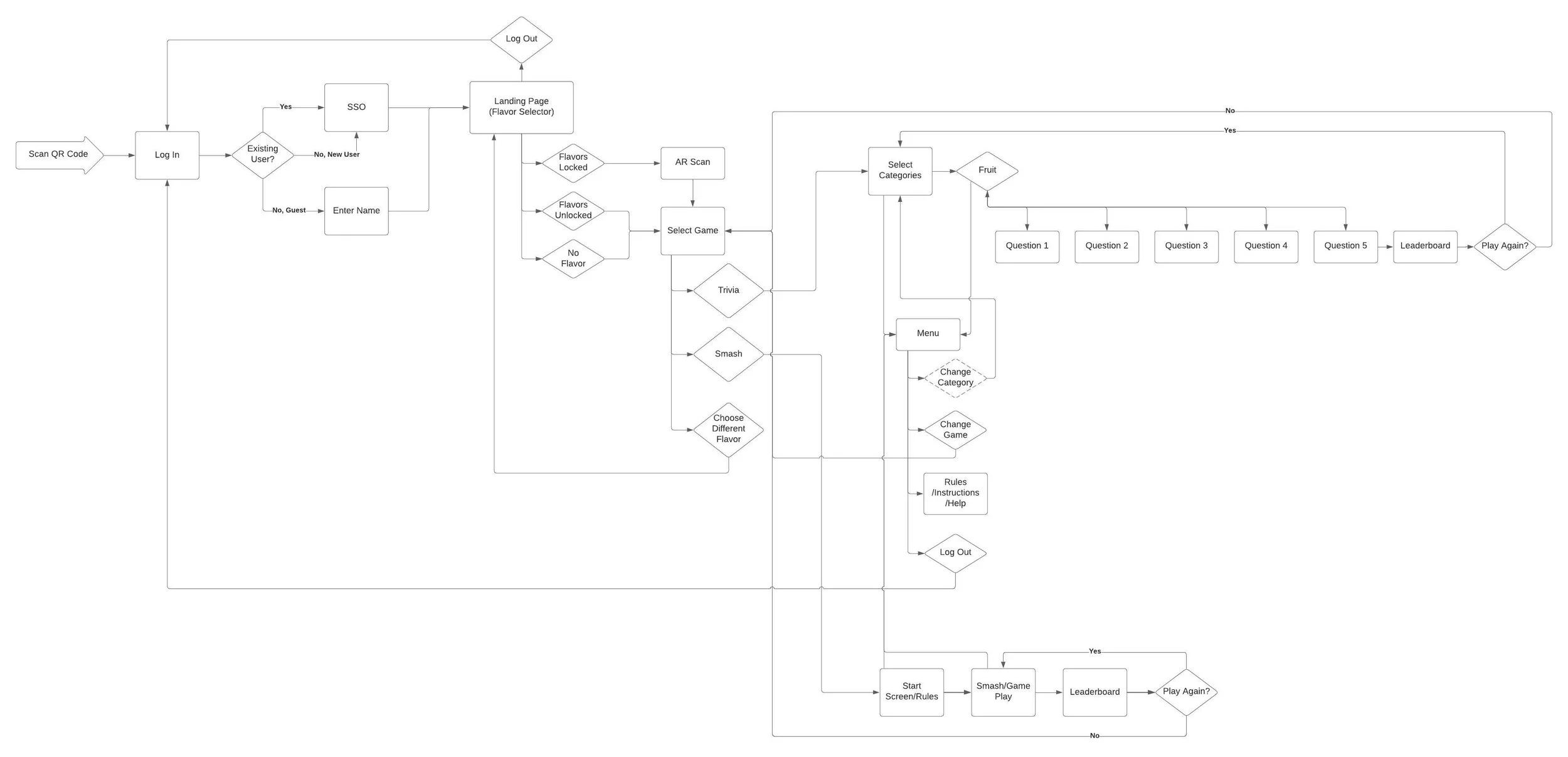 The site map depicts the “flavor scan” that determines the theme/color of the rest of the games. If a flavor package cannot be scanned at location, maybe due to low inventory, we have a skip pathway.