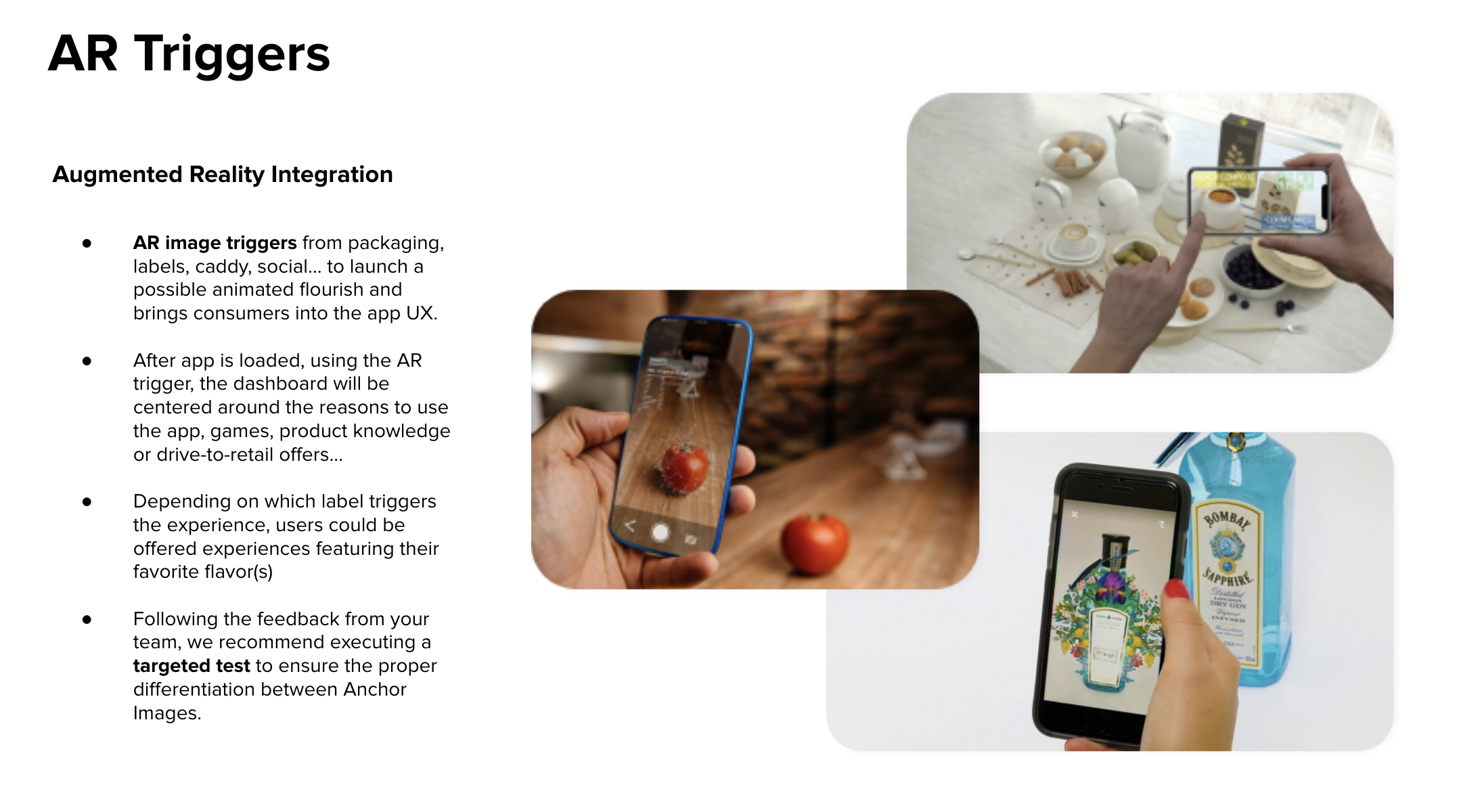 The new and improved feature of the redesign is the AR packaging trigger. We would use a jelly packet label design as the trigger, which would pull the flavor and set a theme to the game experience.