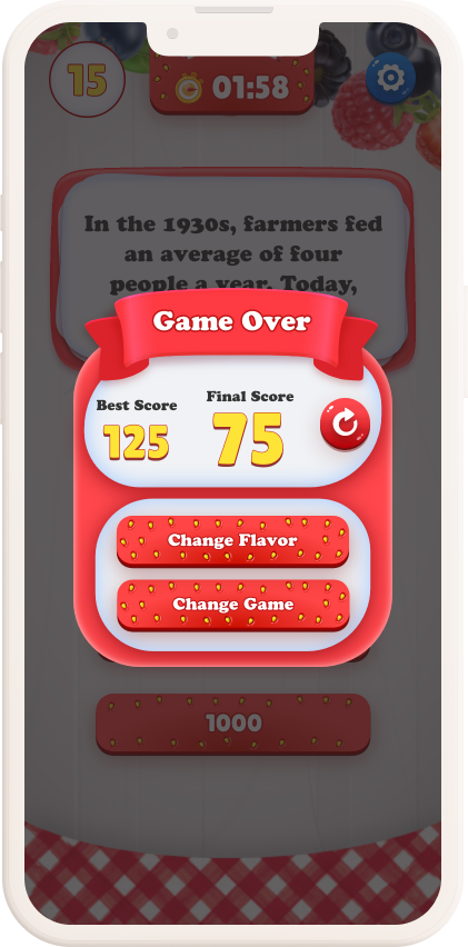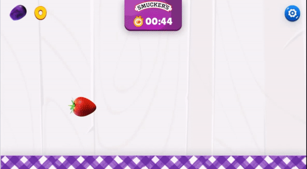 The fruit smash game improved immensely with a few strategic user interactions. To start, we used the fruit theme to set the “correct” fruit to smash. If your theme is Strawberry, then the correct fruit would be Strawberries. For Mixed Berry, we have two - Blueberries & Raspberries.
