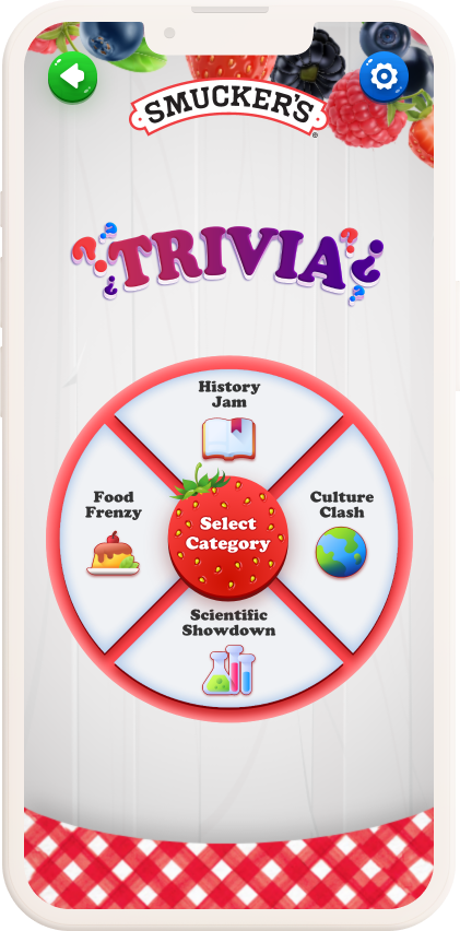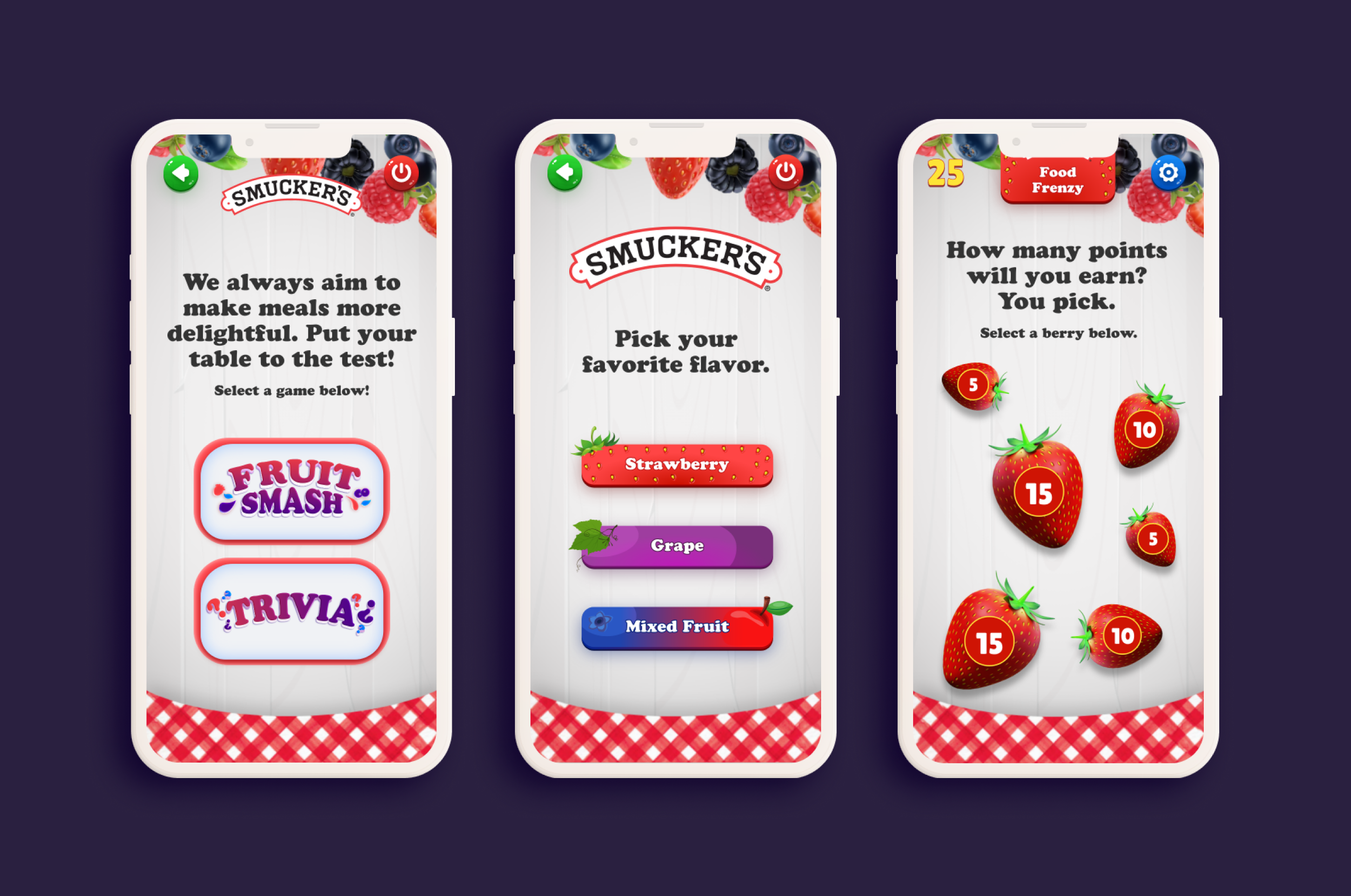 Redesign of Smucker’s table-side app featuring packaging AR triggers for personalized experiences throughout a trivia game and timed fruit smash game.
